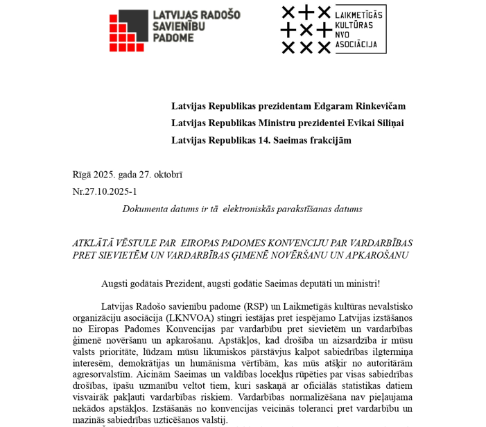 Latvijas Radošo savienību padome (RSP) un Laikmetīgās kultūras nevalstisko organizāciju asociācija (LKNVOA) stingri iestājas pret iespējamo Latvijas izstāšanos no Eiropas Padomes Konvencijas par vardarbību pret sievietēm un vardarbības ģimenē novēršanu un apkarošanu. Apstākļos, kad drošība un aizsardzība ir mūsu valsts prioritāte, lūdzam mūsu likumiskos pārstāvjus kalpot sabiedrības ilgtermiņa interesēm, demokrātijas un humānisma vērtībām, kas mūs atšķir no autoritārām agresorvalstīm. Aicinām Saeimas un valdības locekļus rūpēties par visas sabiedrības drošības, īpašu uzmanību veltot tiem, kuri saskaņā ar oficiālās statistikas datiem visvairāk pakļauti vardarbības riskiem. Vardarbības normalizēšana nav pieļaujama nekādos apstākļos. Izstāšanās no konvencijas veicinās toleranci pret vardarbību un mazinās sabiedrības uzticēšanos valstij.